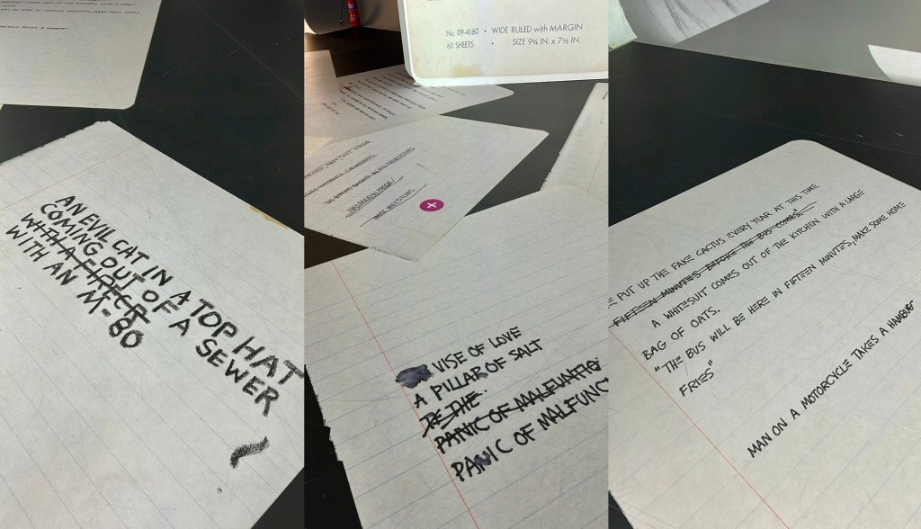The scribbled notes and sketches displayed on everyday notebook paper felt intimate and relatable. Lines like “Man on a motorcycle takes a hamburger” or “The eating… a distraction” made me pause, reflecting on how Basquiat could turn even mundane observations into profound commentary. His ability to transform the ordinary into art is a testament to his brilliance.